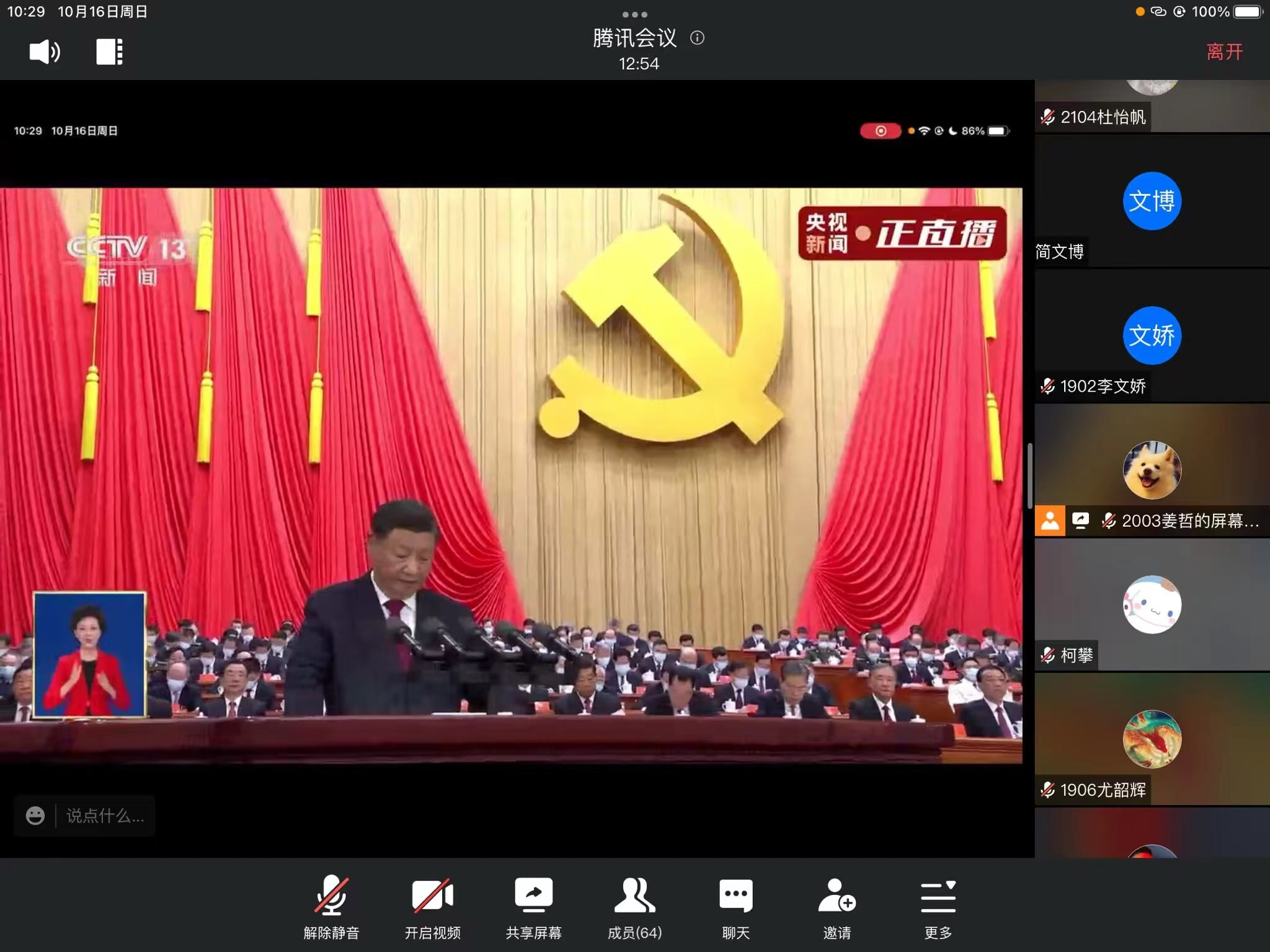 10月16日上午10点,中国共产党第二十次全国代表大会在北京人民大会堂隆重开幕,这是在民族复兴的漫漫征途上迎来的新的历史坐标。法学院党委高度重视,在严格遵守学校疫情防控要求下,精心组织全体教职员工、学生干部、学生党员通过腾讯会议平台集中收听收看党的二十大实况,近700名师生同时在线收看,并展开了热烈讨论。