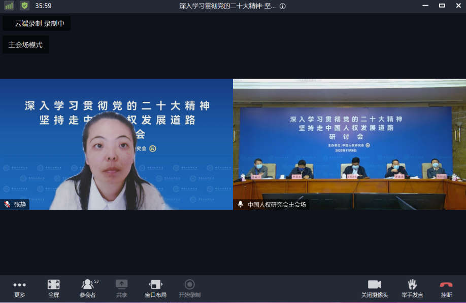 由中国人权研究会举办的“深入贯彻党的二十大精神 坚持走中国人权发展道路”研讨会11月8日在北京召开。中国人权研究会常务理事、理事及人权研究领域的专家学者近100人以线上线下形式参加会议。法学院张静副教授受邀参加了本次研讨会。