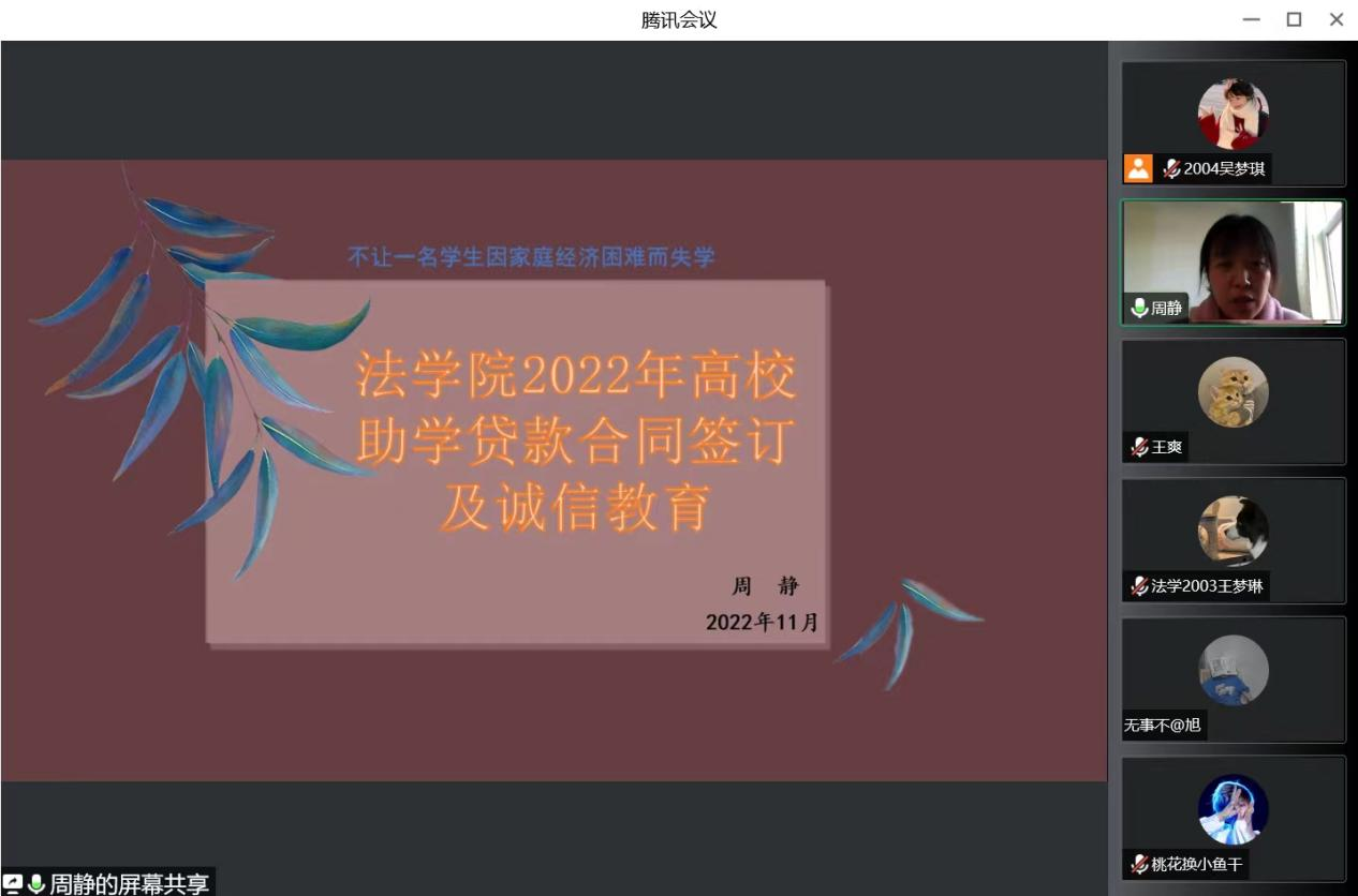 为进一步做好2022年高校国家助学贷款合同审查和签订工作,增强贷款学生诚信还款意识,11月15日,法学院举行线上2022年国家助学贷款合同签订及诚信教育会议。辅导员周静、资助工作人员及32名高校助学贷款学生参加会议。