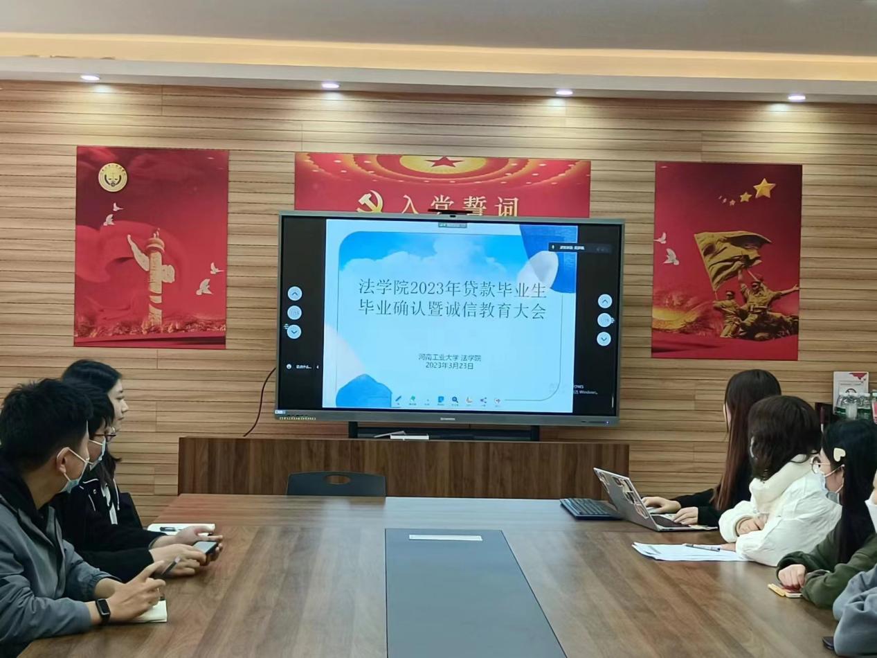 为贯彻落实国家助学贷款政策及相关文件精神,增强毕业生诚信意识,确保贷款毕业生毕业确认工作顺利进行,法学院于3月23日在3424会议室,以线上、线下相结合的方式,举行贷款毕业生毕业确认暨诚信教育会议。学院负责资助工作的辅导员周静、资助工作专员及2023届贷款毕业生参加会议。