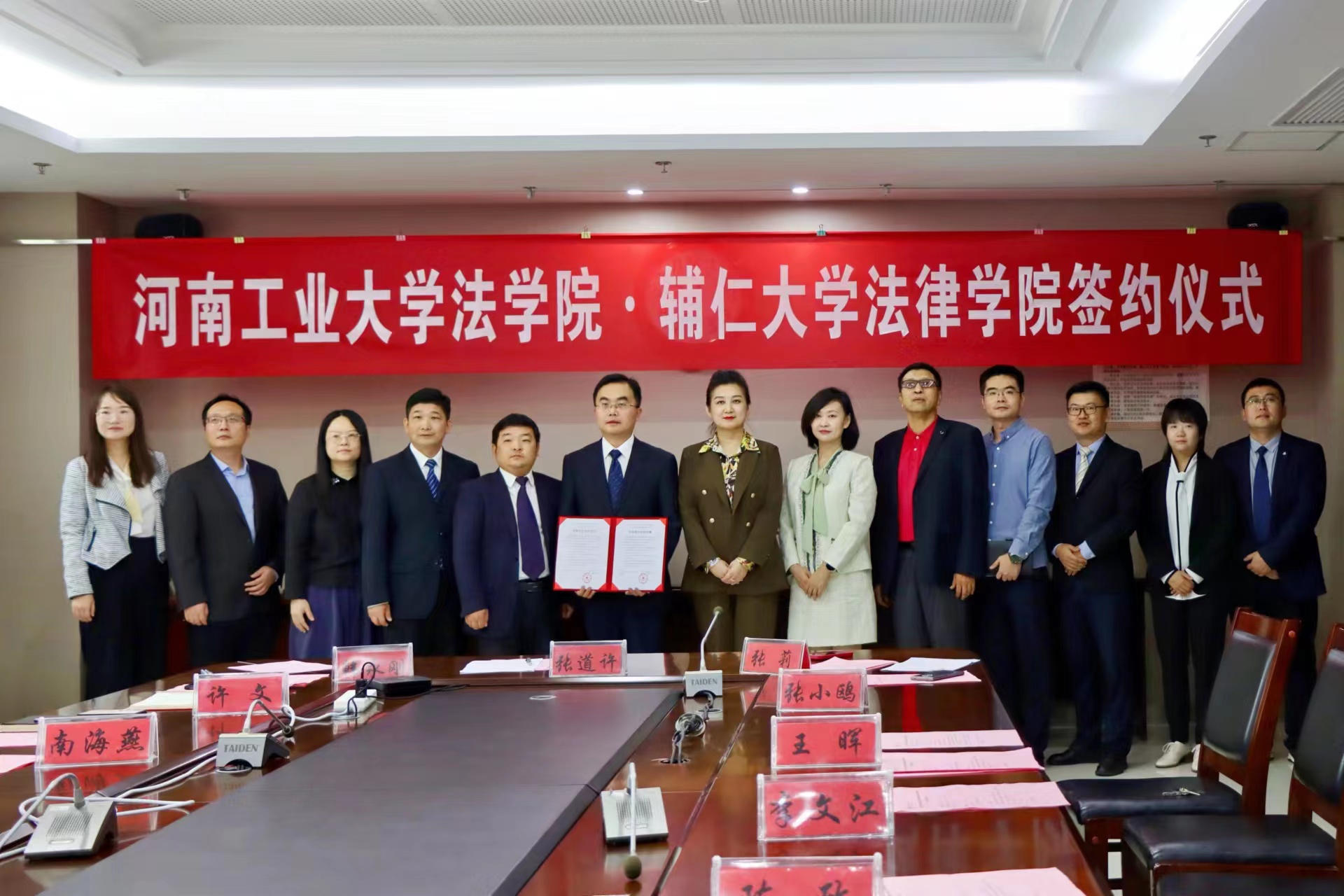 前期双方就学生短期研修交流、教师访学讲学、举办学术研讨会等方面达成共识。张道许、吴志光分别代表河南工业大学法学院、辅仁大学法律学院签署了《辅仁大学学校财团法人辅仁大学法律学院与河南工业大学法学院交流与合作约定书》,并合影留念。