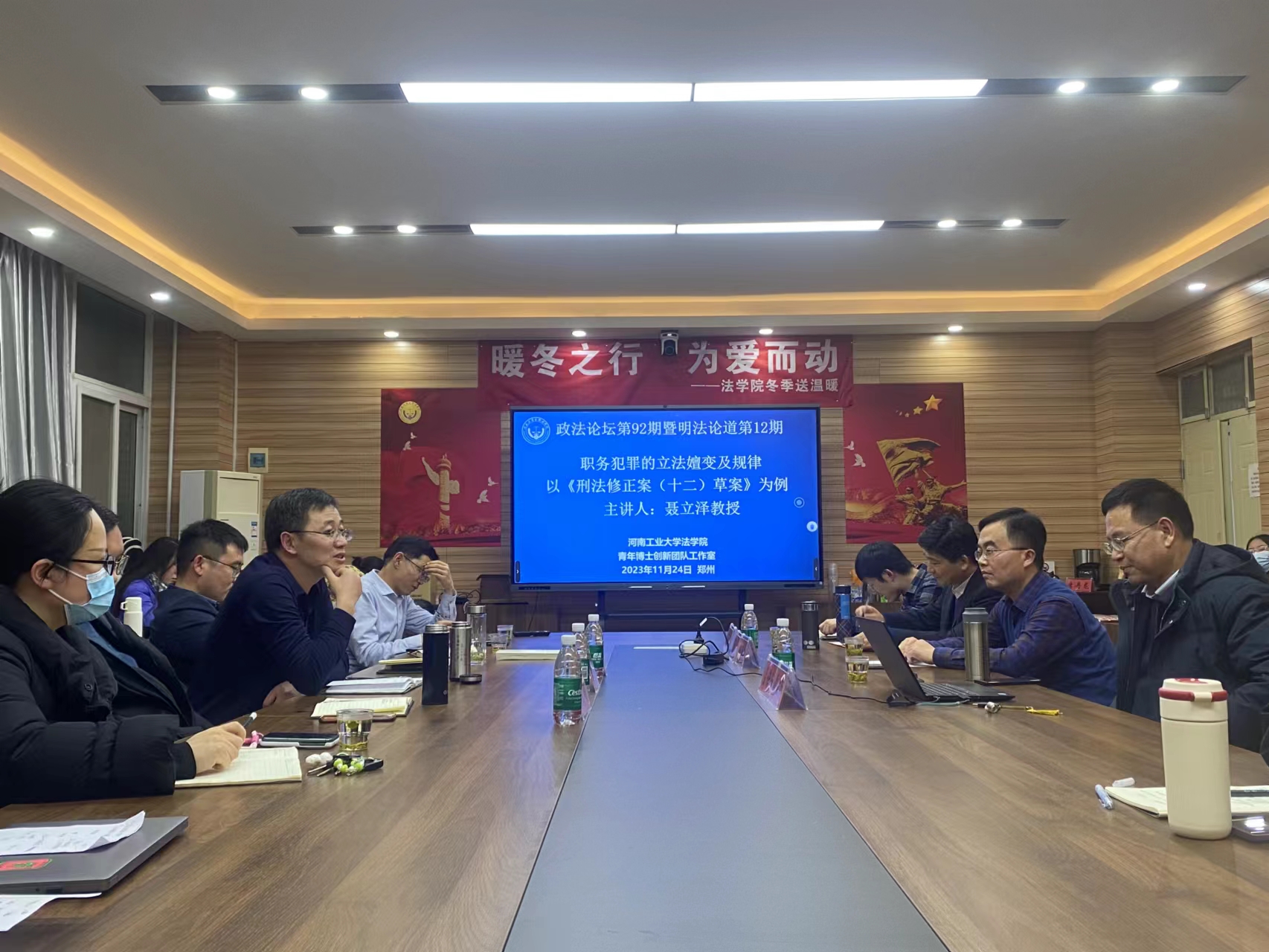 11月24日,法学院在学院3424会议室成功举办“政法论坛第92期暨明法论道第12期”学术活动。此次活动邀请中山大学教授、博士生导师、广东省网络犯罪研究基地主任聂立泽作题为“职务犯罪的立法嬗变及规律—以《刑法修正案十二(草案)为例》”的学术报告,王君祥教授、单奕铭博士、王文明博士、陈辉博士作为与谈嘉宾。法学院党委副书记许文、副院长南海燕及部分师生参加报告会。报告会由法学院院长张道许教授主持。