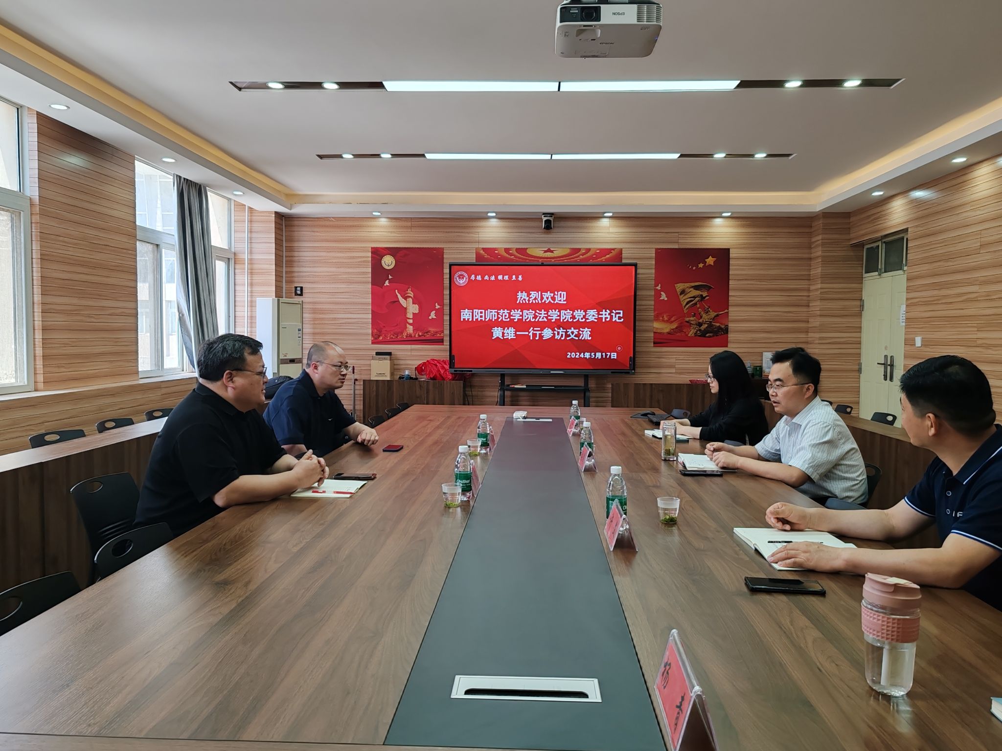 5月17日上午,南阳师范学院法学院党委书记黄维、法学基础课程教研室主任翟明煜一行到法学院开展调研并交流座谈。法学院院长张道许、党委副书记、副院长许文、教学副院长南海燕、党政办副主任杨青参加座谈,会议由张道许主持。