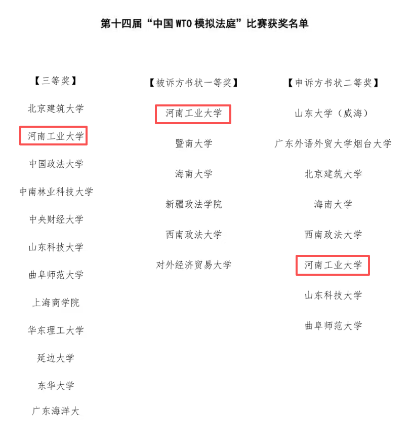 2025年12月7日,第十四届中国WTO模拟法庭竞赛在西南政法大学闭幕。在全国66所知名高校的竞争中,河南工业大学代表队荣获全国三等奖、应诉方书状一等奖、申诉方书状二等奖的优异成绩。“中国WTO模拟法庭竞赛”是由中华人民共和国商务部和高等院校主办的国际法模拟赛事,是加强涉外法治实践的重要平台。
