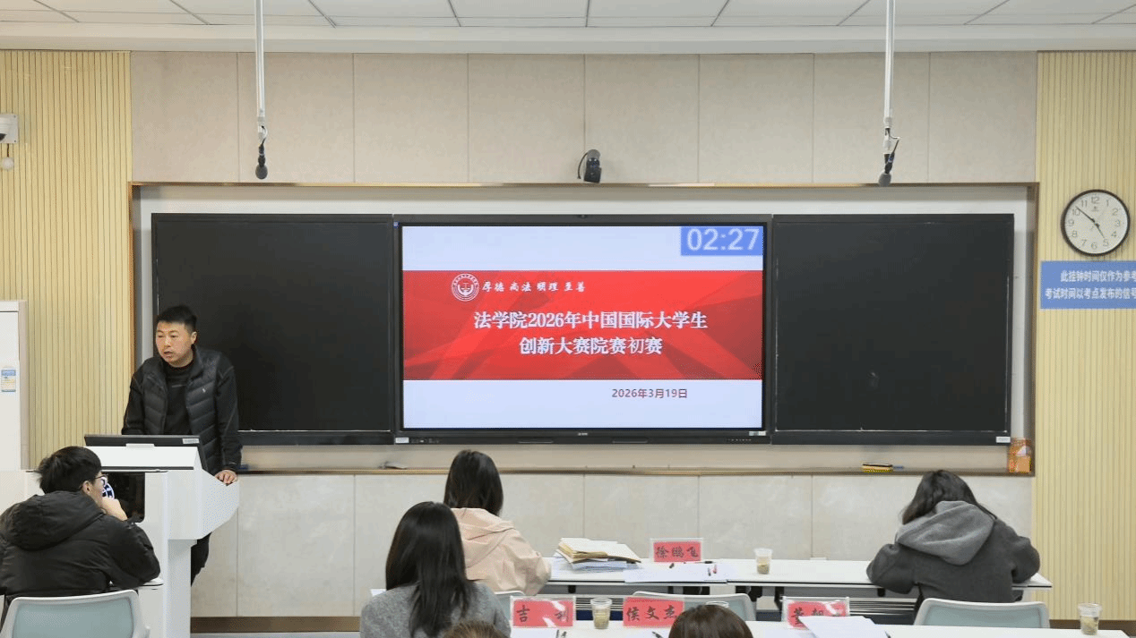 为深入推进大学生科技创新教育,激发法学学子的创新思维,3月19日下午,法学院在博识楼3211教室举办2026年中国国际大学生创新大赛院赛。学院特邀校就业创业中心创业指导科科长徐鹏飞莅临指导,教师代表参加比赛活动并担任评委。