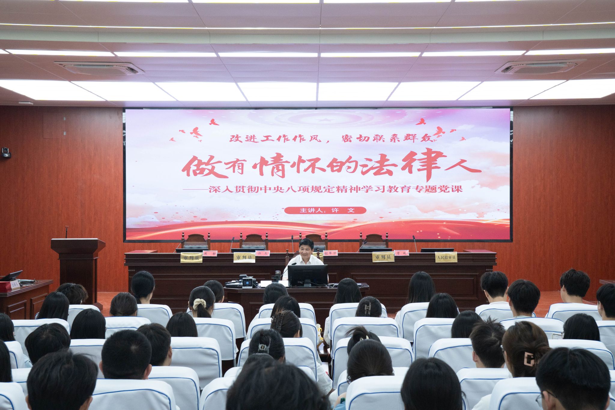 许文结合中央八项规定精神,以《改进工作作风,密切联系群众——做有情怀的法律人》为题,从中央八项规定的提出、中央八项规定与中央八项规定精神、违反中央八项规定精神的具体表现、遵守中央八项规定精神的基本点、做有情怀的法律人的着力点五个维度,带领大家重温中央八项规定提出的历史背景、厘清概念要义、亮明纪律红线、明确行为准则。他勉励毕业生党员要坚定理想信念,心中有党;坚持需求导向,心中有民;责任重于泰山,心中有责;严守纪律规矩,心中有戒。他强调,要将中央八项规定精神作为砥砺党性、锤炼作风的终身课题,将“有情怀”融入职业生涯点滴,努力成长为政治坚定、业务精湛、作风优良的优秀法律人才。许文授课立意高远、内涵丰富、语重心长,既有理论高度,又有实践深度,与会党员深受教育和鼓舞。