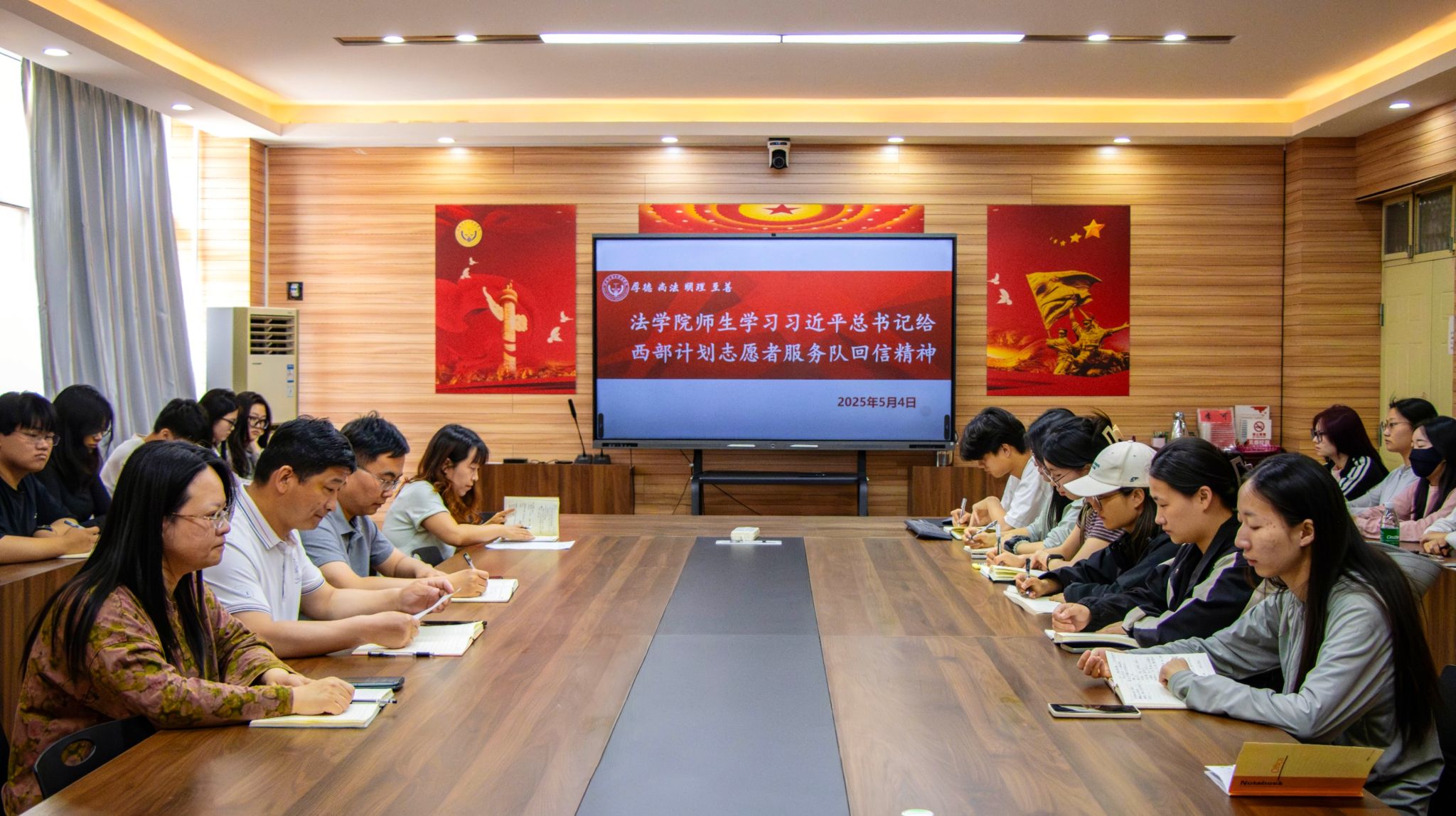 在五四青年节之际,法学院于5月4日在3424会议室集体学习习近平总书记给谢依特小学戍边支教西部计划志愿者服务队队员的回信。学院党委书记许文、院长张道许、副院长南海燕、学生党员、2025届西部计划志愿者及团委、学生会工作人员共50余人参加学习。学习会由学院团委副书记周静主持。