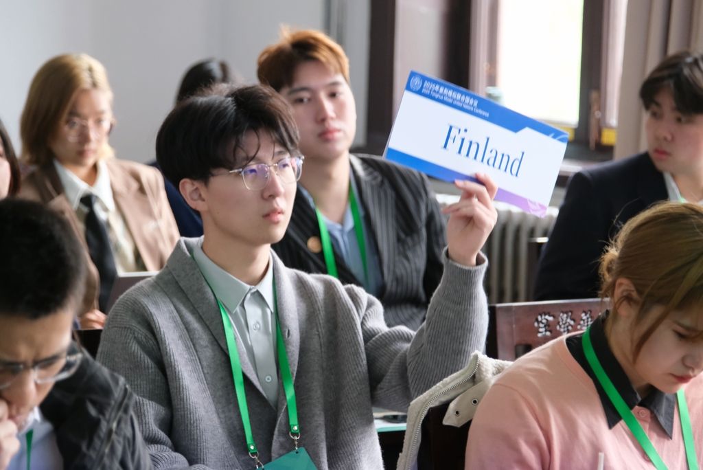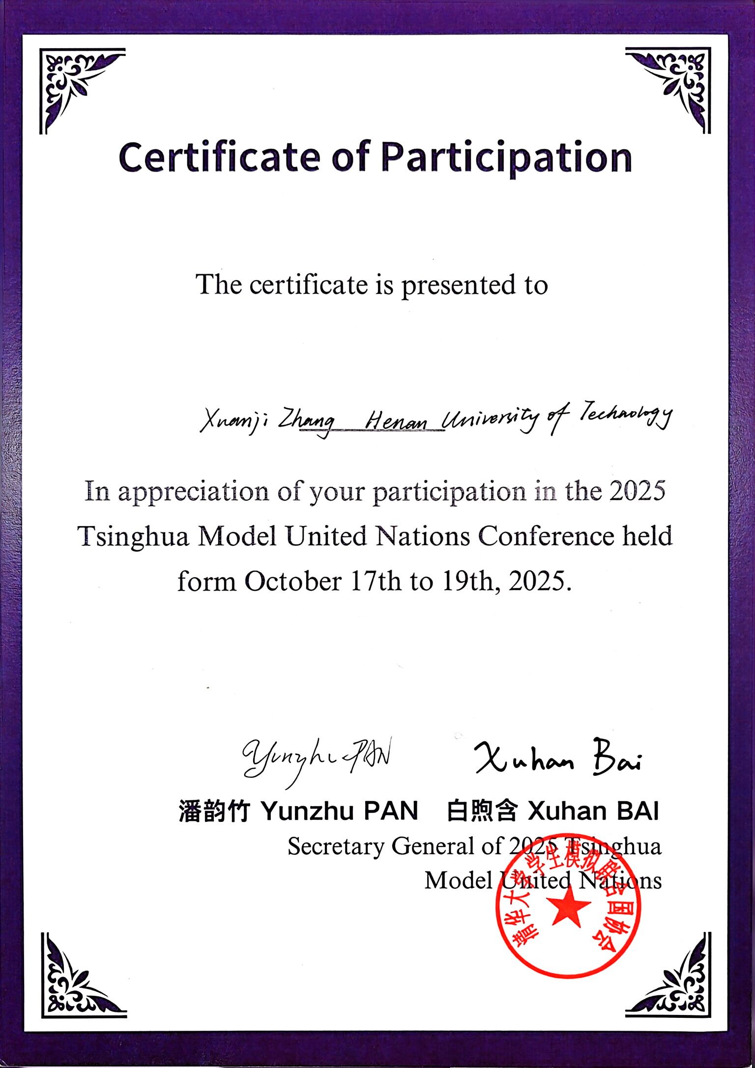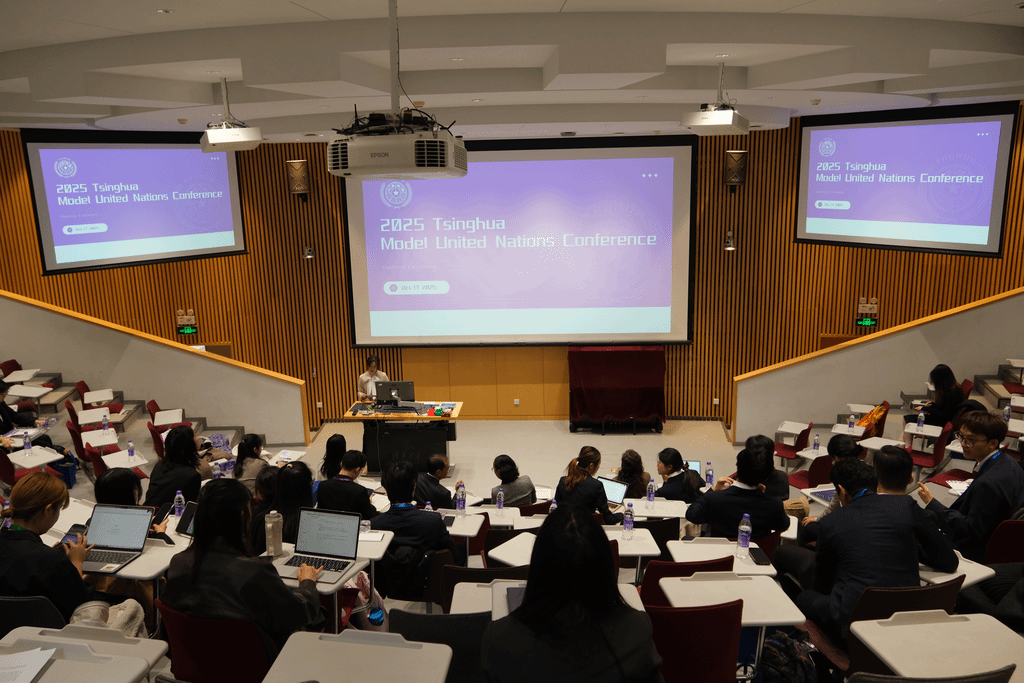 为庆祝联合国成立八十周年,2025年10月17日,紫荆模拟联合国会议在清华大学开幕。法学院2023级学生张轩基代表我校参加国际模拟外交实践活动。