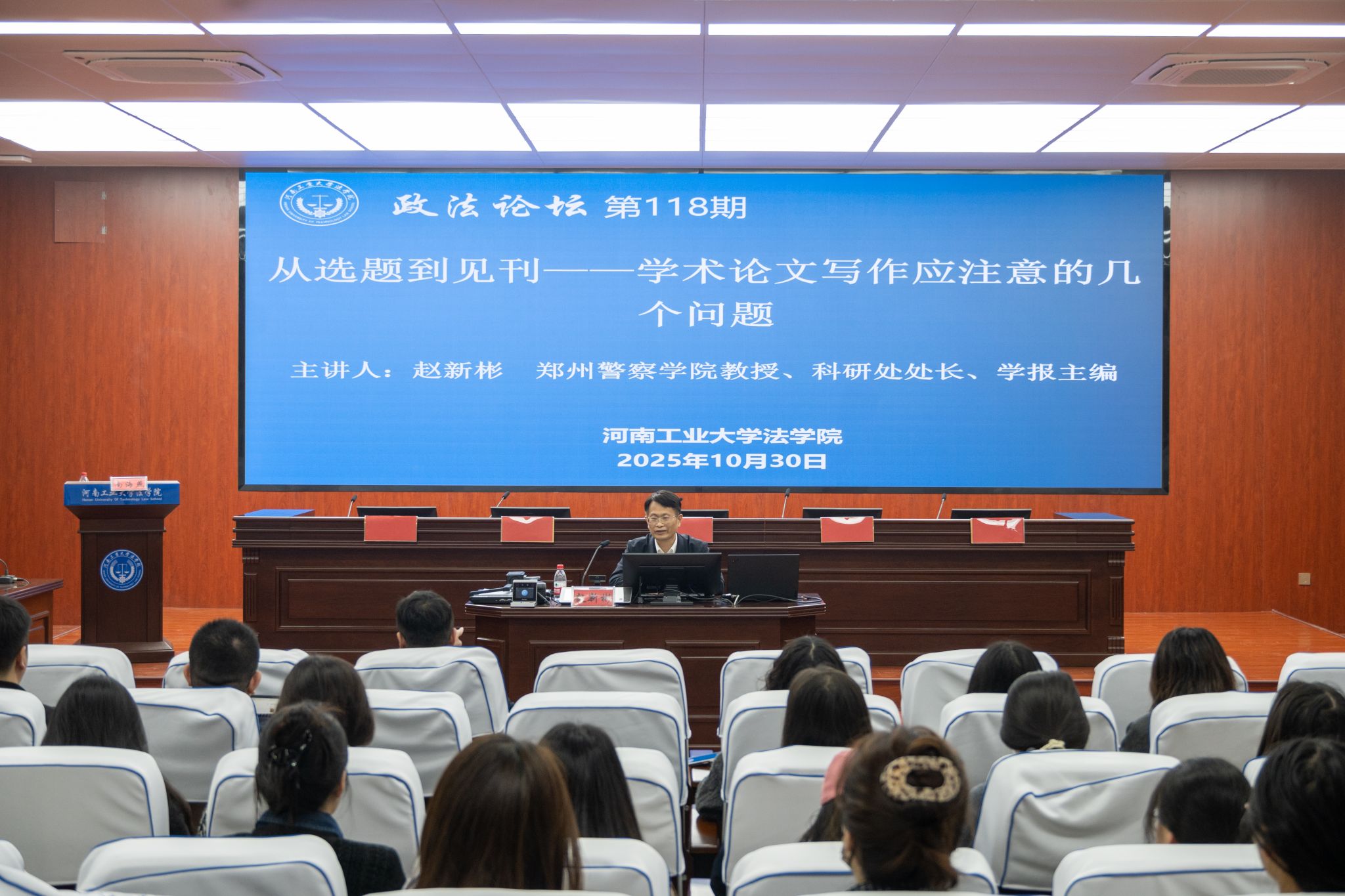 10月30号,法学院在模拟法庭成功举办“政法论坛”第118期学术报告会。郑州警察学院教授、科研处处长、学报主编赵新彬教授以“从选题到见刊——学术论文写作应注意的几个问题”为主题开展了一场精彩的学术报告。报告由法学院副院长南海燕主持。