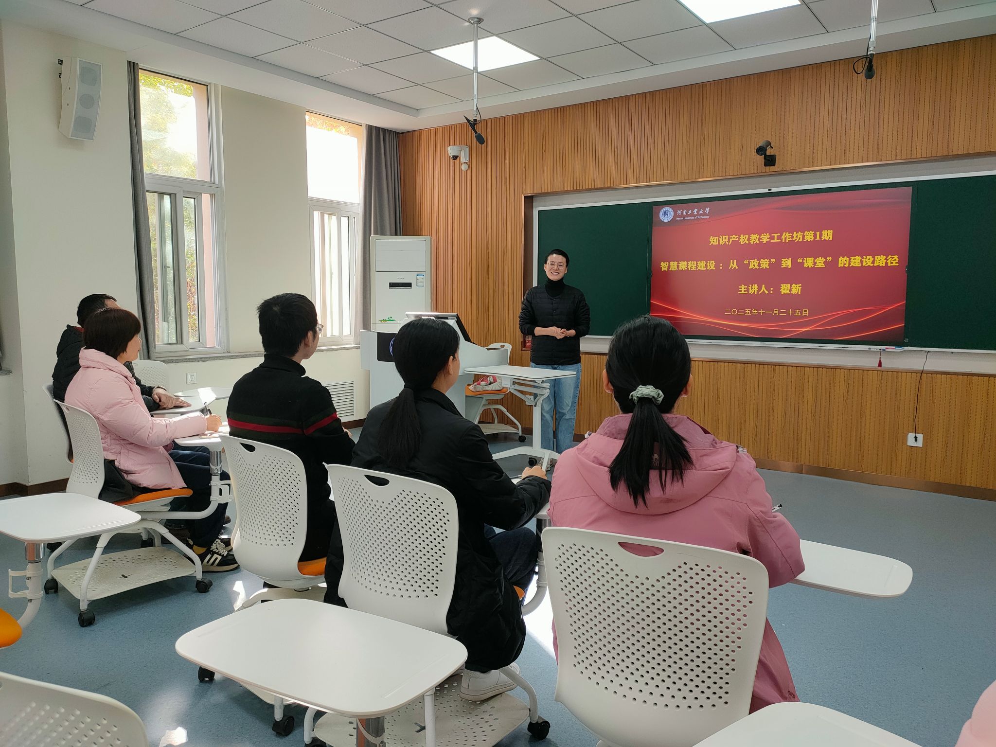 为进一步引导教师重视教学,加强智慧课程建设,提升课堂教学质量,11月25日下午,知识产权教研室在3227智慧教室成功举办识产权教学工作坊第1期“人工智能赋能课程教学”。本次活动围绕智慧课程建设开展研讨,特别邀请了第六届河南省本科高校教师课堂教学创新大赛一等奖获得者、河南省本科高校智慧课程负责人翟新博士作了题为“智慧课程建设—从“政策”到“课堂”的建设路径”的专题报告。活动由党支部书记、教研室主任苏冬冬主持,教研室全体教师参加。