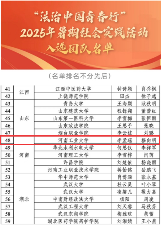 7月30日,共青团中央维护青少年权益部公布了“法治中国青春行”2025年暑期社会实践活动入选团队名单。经评审,全国六百多支高校团队中,遴选出87支团队,我院“豫途有声”实践团队成功入选。
