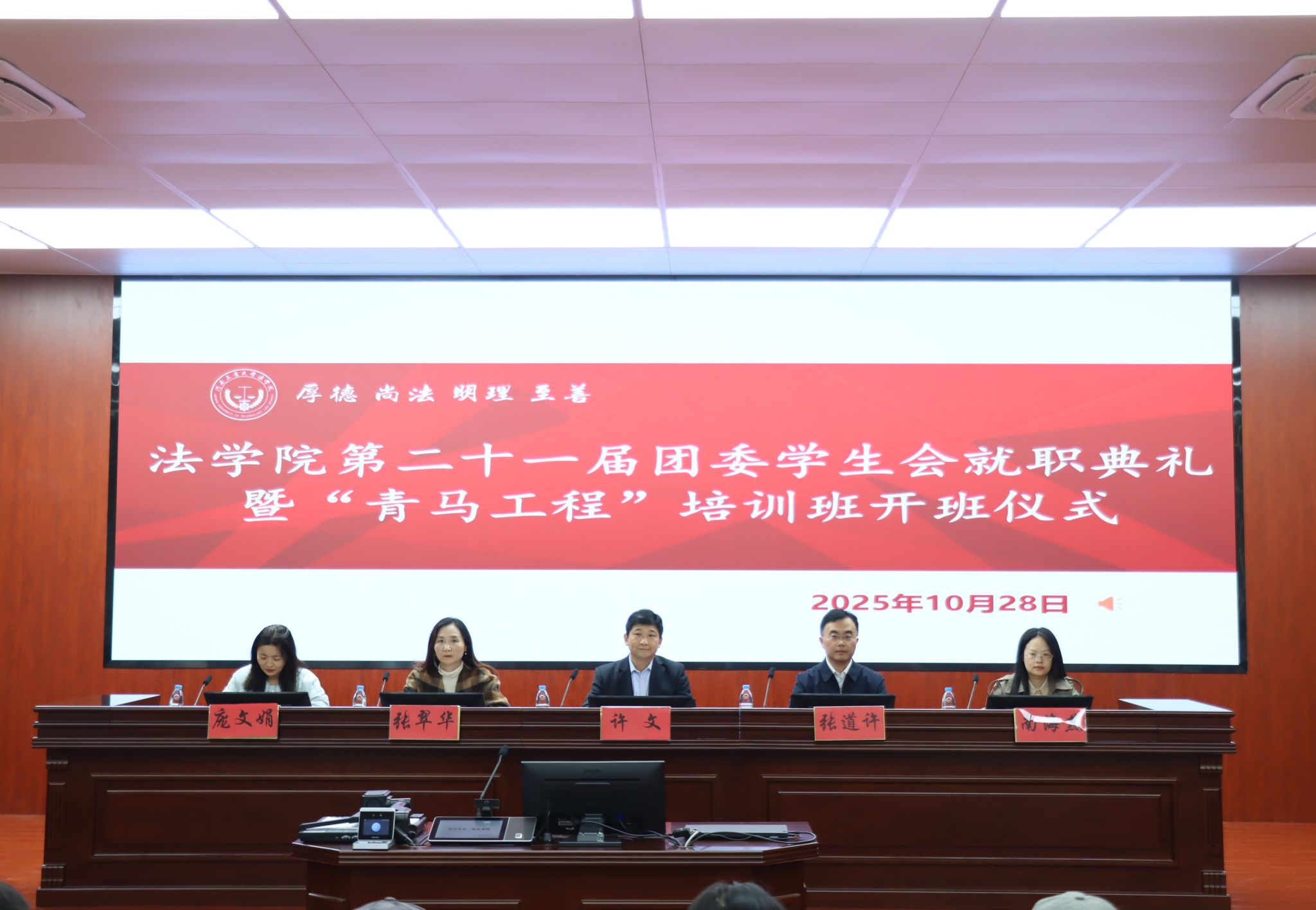 10月28日,法学院在智慧模拟法庭3121举行第二十一届学生工作人员就职典礼暨“青马工程”团学骨干培训班开班仪式。法学院领导班子、全体辅导员、第二十一届团委学生会工作人员和青马班全体学员参加会议。会议由学院团委副书记周静主持。