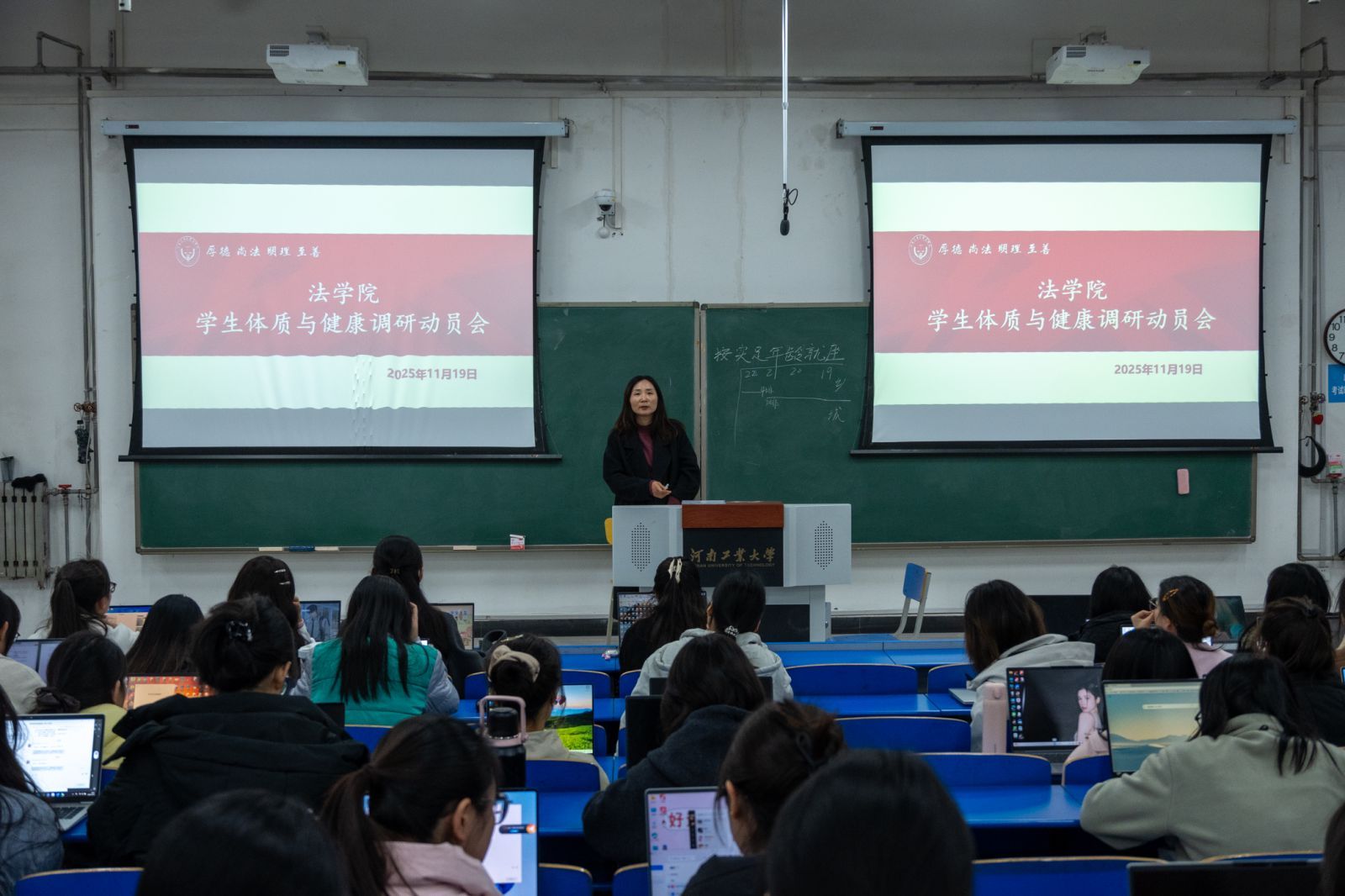 为积极响应河南省教育厅2025年对我校大学生体质与健康调研工作的要求,引导学生重视身体素质提升,确保体测抽查工作顺利开展,11月19日下午,法学院在博识楼3135教室召开大学生体质与健康调研工作动员会。学院党委副书记张翠华、团委副书记周静及全体抽测学生参加会议,会议由周静主持。