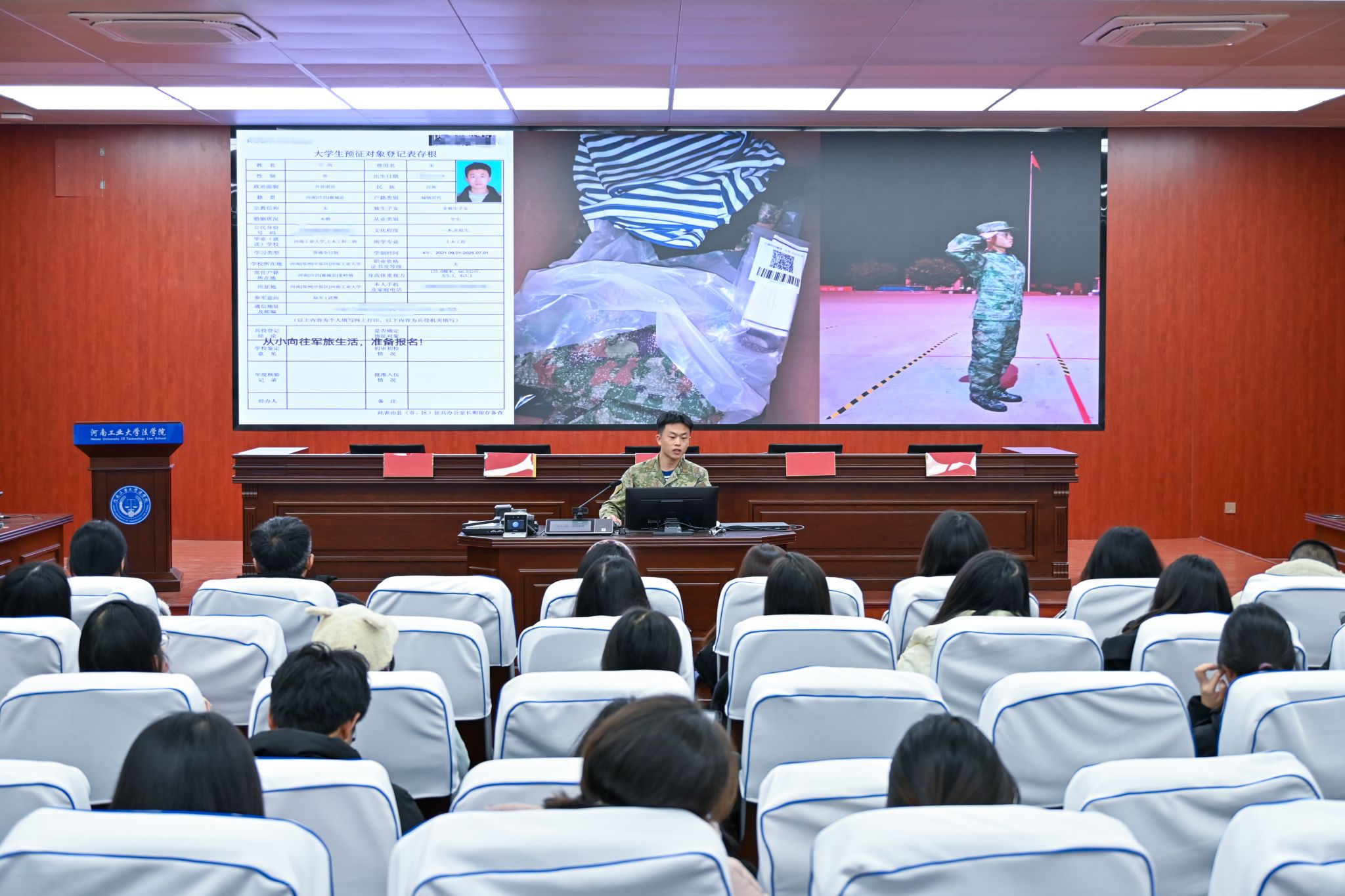 宣讲团成员人工智能与大数据学院孙旸坤和土木工程学院李一帆深情分享了在军队历练中的成长轨迹与蜕变历程,生动展现了军营生活的独特魅力,深刻诠释了新时代军人忠诚履职的国防使命与责任担当。法学院学生会副主席张健文从征兵条件、报名流程、体检标准、政治审查要求等几方面,详细解读了大学生参军入伍相关政策,重点阐述了“入伍后学业如何衔接”“不同军种的招录要求”等方面的内容,鼓励同学们积极响应国家号召,投身国防建设。